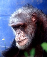 Unlike most chimpanzees whose feet are dark or black, Tom had a pink, scarred foot resulting from an injury. Tom was always fully aware of this difference between him and other chimpanzees.