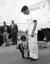 Following Ham’s successful flight, news photos showed a “smiling” chimpanzee among his human peers at NASA. But a demonstration designed to show the press how much Ham enjoyed his capsule was a failure. As cameras rolled, four adult men could not get Ham to reenter his space capsule, even though he had been trained that his refusal would result in painful electric shocks.